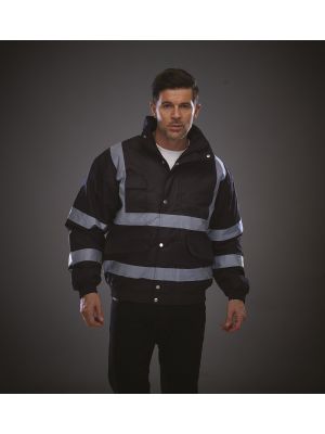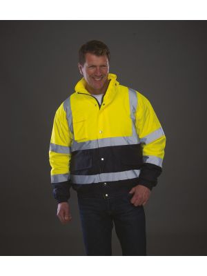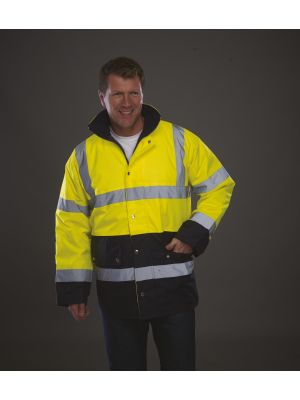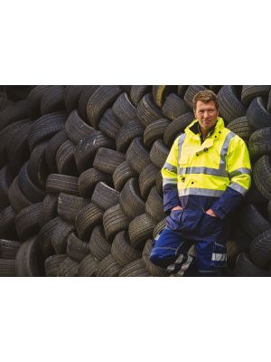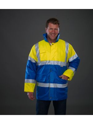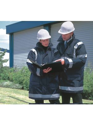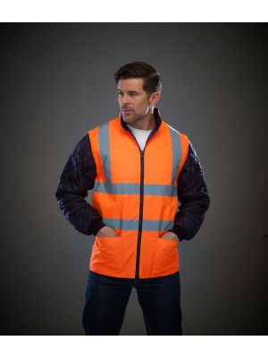 100 % poliéster. Dos tiras reflectantes 3M alrededor del cuerpo y de los brazos y una en cada hombro. Cremallera en todo el largo en la parte delantera. Puños y cintura elásticos. Dos bolsillos interiores con ribete. Cuello alto. Cumple con la norma EN ISO 20471:2013 de categoría 3 y con la norma sobre «Prendas de Alta Visibilidad» de las vías férreas UK GO/RT 3279 emitida 8:2013 (Hi-Vis Orange y Hi-Vis orange/Navy).