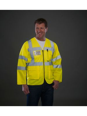 100% poliéster. Tiras reflectantes de 3,5 cm de ancho alrededor del cuerpo, los brazos y en cada hombro; bolsillo para teléfono móvil o walkie-talkie en el lado izquierdo del pecho; cierre con cremallera completa en la parte delantera; dos bolsillos inferiores con solapas y accesibles desde la parte superior y lateral; bolsillos para bolígrafos y llaveros; bolsillo para la identificación en el lado derecho del pecho; gran superficie en la espalda para la decoración. Cumple con las normas EN ISO 20471:2013 Categoría 3.