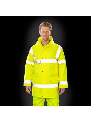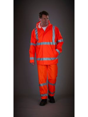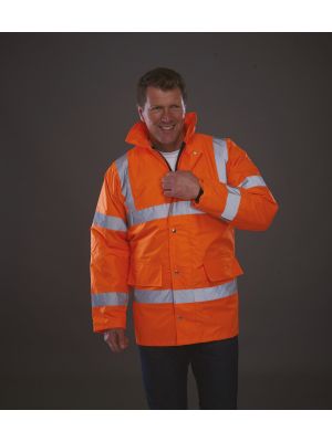 100% poliéster 300D con revestimiento de PU impermeable, relleno acolchado de 190 g/m² y forro de nylon. Cremallera ultrarresistente con solapa antitempestad con botones a presión. Dos bolsillos exteriores con solapa antitempestad. Puños antitempestad de punto. Capucha con cordones de ajuste integrada en el cuello. Bolsillo interior en el pecho. Costuras cosidas y selladas para la impermeabilidad. Cumple con las normas EN ISO 20471:2013 Categoría 3 y EN343 sobre protección contra el mal tiempo. Cumple con la norma relativa a las «Prendas de Alta Visibilidad» de las vías férreas UK GO/RT 3279 emitida 8:2013 (Hi-Vis Orange solamente).