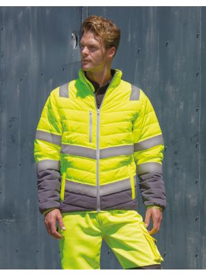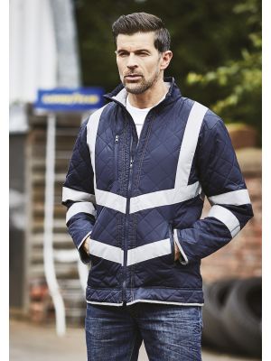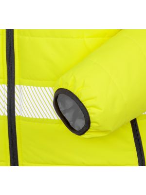 100% poliéster. Revestimiento de PU 300D. Relleno acolchado en forma de rombos de poliéster de 190g. Forro de nylon. Cremallera ultrarresistente con solapa antitempestad con cierre de botones a presión. Dos bolsillos exteriores con solapa. Cintura y puños elásticos a tono. Bolsillo parche interior. Costuras cosidas y selladas para la impermeabilidad. Capucha oculta en el cuello. Cumple con las normas EN ISO EN20471:2013 Categoría 3 y EN343 sobre protección contra el mal tiempo: solo Hi-Vis Yellow y Hi-Vis Orange. También cumple con la norma relativa a las «Prendas de Alta Visibilidad» de las vías férreas UK GO/RT 3279 emitida 8:2013 (Hi-Vis Orange solamente).