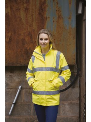 Chaqueta 100% poliéster que combina las funciones cortavientos, impermeable y transpirable. Forro de malla a tono. Costuras estancas termoselladas. Capucha integrada en el cuello con cierre de tira ajustable. Cierre con cremallera de doble cursor ultrarresistente con solapa con tira ajustable. Bolsillos laterales debajo con solapa con cierre de tira ajustable y ribete reflectante. Plaqueta de tira ajustable en puños; interior de felpa. Bolsillo en el pecho interior en el lado derecho para teléfono móvil. Corte entallado y cintura semielástica para un aspecto más elegante. Cremallera de personalización invisible en el bajo de la prenda (lado interior). Cumple con las normas EN ISO 20471 Categoría 3 y EN 343:2003 + A1:2007 Categoría 3,3.
