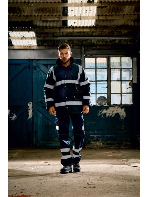 100% poliéster 300D con revestimiento de PU impermeable, relleno acolchado de 190 g/m² y forro de nylon. Dos tiras reflectantes 3M de 5 cm alrededor del cuerpo, de los brazos y una en cada hombro. Cremallera ultrarresistente en la parte delantera con solapa antitempestad con botones a presión. Dos bolsillos exteriores con solapa antitempestad. Puños antitempestad de punto. Capucha integrada en el cuello con cordones. Bolsillo interior en el pecho. Costuras cosidas y selladas para la impermeabilidad. Cumple con las normas EN ISO 20471:2013 Categoría 3 y EN343 Cat. 3 Niv. 1 sobre protección contra el mal tiempo. Hi-Vis Orange/Navy también cumple con la norma relativa a las «Prendas de Alta Visibilidad» de las vías férreas UK GO/RT 3279 emitida 8:2013. 25 lavados max. Lavable a máquina a 40 ° C. No lavar en seco.