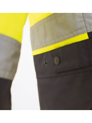 Parka convertible 4 en 1. Combinada, desmontable, con cintas reflectantes y parte superior de alta visibilidad. Exterior: Impermeable en tejido Oxford de cuello alto con capucha interior ajustable con cordón. Cierre de cremallera de doble tirador oculta por doble solapa y cierre de corchetes. Dos bolsos laterales solapados con cremallera de nylon. Una cinta reflectante en hombros y dos en pecho, espalda y mangas. Bocamanga interior con bies elástico. Forro interior de rejilla. Interior: Chaqueta Workshell con mangas desmontables unida a la prenda exterior por medio de cremalleras. Cuello alto y cierre de cremallera de nylon. Un bolso de pecho y dos laterales interiores con cierre de cremallera. Una cinta reflectante en hombros y dos en pecho, espalda y mangas. Bocamanga ajustable con velcro.