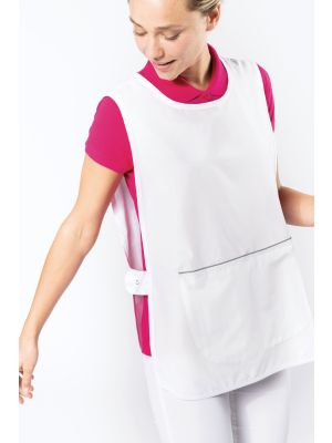 65% poliéster / 35% algodón. Lavable a 60°C. Tejido resistente y corte cómodo. Bolsillo grande delantero de 2 compartimentos con 1 pequeño bolsillo interior. Cintas de ajuste lateral con 2 botones de presión. Ribete contrastado en la parte superior del bolsillo. 1 etiqueta interior para el nombre. Dobladillo con forma redonda. Largo de la talla L/XL: 78 cm. Certificado STANDARD 100 by OEKO-TEX®N° CQ1007/8, IFTH.