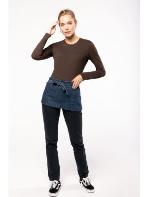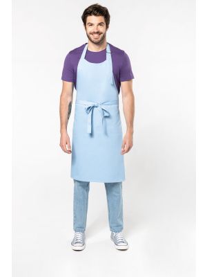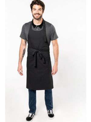65% poliéster / 35% algodón (Denim, Black Denim 65 % algodón / 35 % poliéster). Lavado doméstico a 60 ºC. Tira en cuello con hebilla de metal para ajustar el largo del delantal. Sin bolsillos. Dimensiones: 90 cm de largo x 76 cm de ancho. Certificado STANDARD 100 by OEKO-TEX®N° CQ1007/8, IFTH.