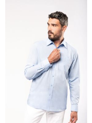65% poliéster / 35% algodón popelina. Tejido de cuidado-fácil (Easy-care). Cuello cut-away, Botones a tono. Bolsillo en pecho izquierdo. Canesú doble detrás. Acabado con costuras vueltas. Acabados con doble pespunte. 1 botón adicional. Forma redonda en bajo. Certificado STANDARD 100 by OEKO-TEX®N° CQ1007/8, IFTH.