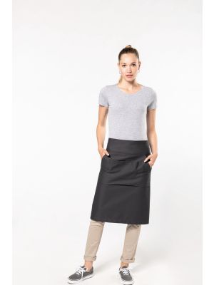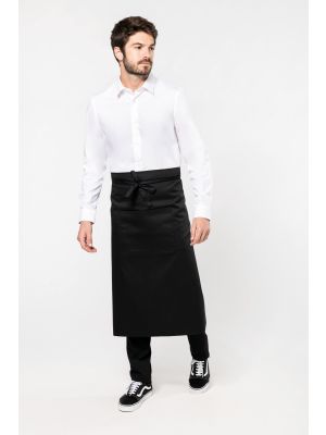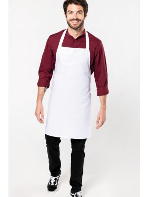 65% poliéster / 35% algodón. Lavado doméstico a 60 ºC. Lavado industrial a 85 ºC conforme a las exigencias de la norma ISO15797. Tira en cuello con hebilla de metal para ajustar el largo del delantal. Bolsillo delantero grande con dos compartimentos. Medidas: 90 cm x 76 cm (largo/ancho). Bolsillo: 20 cm x 31,5 cm (largo/ancho). Certificado STANDARD 100 by OEKO-TEX® N° CQ 1007/8, IFTH.