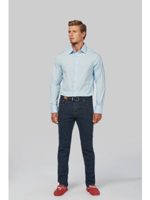 100% popelina de algodón. Material de Cuidado-fácil (tratamiento Easy Care). Cuello cut-away. Botones del mismo tono. Bolsillo en pecho izquierdo. Canesú doble en espalda. Acabado con costuras vueltas. Puños redondeados ajustables con tira de botones. 2 botones adicionales. Dobladillo con forma redonda. Certificado STANDARD 100 by OEKO-TEX®N° CQ1007/7, IFTH.