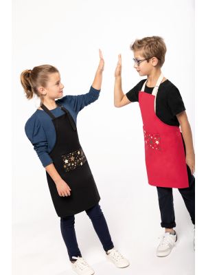 100% algodón. Lavado doméstico a 60ºC. Hebilla de metal a la altura del cuello para ajustar el largo del delantal. Bolsillo grande con motivo de estrellas serigrafiado en la parte delantera. Tira de ajuste en cuello y cintura contrastada en beige en el modelo Red, y a tono en el modelo Black. Etiqueta autoadhesiva extraíble «Origine France Garantie. Produit en Bretagne» en la parte delantera. Etiqueta OFG (Origine France Garantie). Dimensiones (alto x ancho): 60 cm x 48 cm. Bolsillo (alto x ancho): 10 cm x 20 cm.