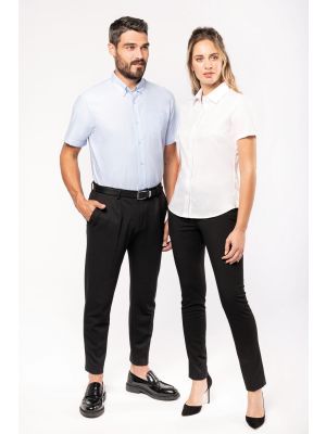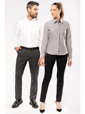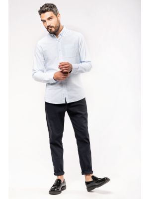 100% algodón. Forma entallada. Cuello con botones. Interior de cuello y puños con ribete contrastado. Botones del mismo tono. Bolsillo en pecho izquierdo con esquinas redondeadas. Canesú doble trasero. Puños ajustables con esquinas redondeadas mediante tapeta con botón. 2 botones adicionales. Dobladillo con forma redonda. Certificado STANDARD 100 by OEKO-TEX®N° CQ1007/8, IFTH.