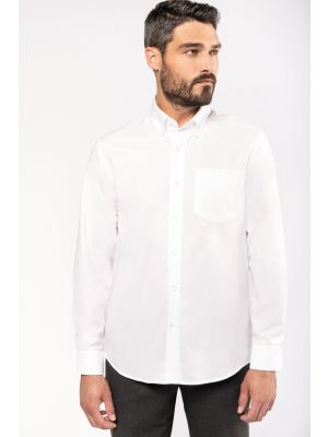 70% algodón Oxford 30% poliéster. Tejido de cuidado fácil (tratamiento Easy Care). Cuello con botones. Botones tono sobre tono. Bolsillo con acabado en V en pecho izquierdo. Canesú doble detrás con 2 pliegues. Puños redondeados ajustables con tapeta con botones. 2 botones adicionales. Dobladillo con forma redonda. Certificado STANDARD 100 by OEKO-TEX® N° CQ 1007/7, IFTH.