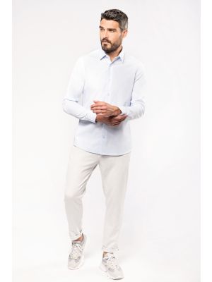 100% popelina de algodón. Tejido de fácil cuidado (tratamiento Easy Care). Cuello cut-away. Botones tono sobre tono. Bolsillo en pecho izquierdo. Canesú doble con 2 pliegues en parte trasera . Acabado con costuras vueltas. Puños redondeados ajustables con tapeta con botón. 2 botones adicionales. Dobladillo con forma redonda. Certificado STANDARD 100 by OEKO-TEX®N° CQ1007/7, IFTH.