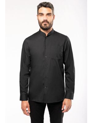 65% poliéster / 35% popelina de algodón. Tejido de cuidado-fácil (Easy-care). Cuello Mao. Botones a tono. Bolsillo con acabado en V en pecho izquierdo. Puños redondeados ajustables con tapeta resistente al desgarro. 1 botón adicional. Dobladillo con forma redonda. Certificado STANDARD 100 by OEKO-TEX®N° CQ1007/8, IFTH.