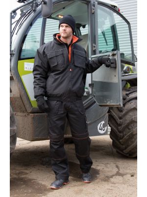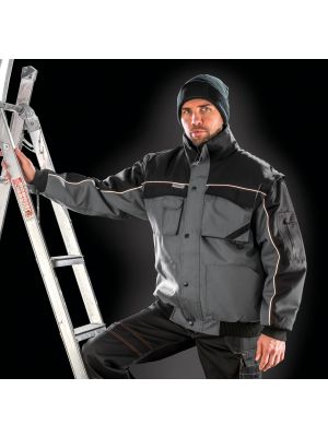 Exterior: Poliéster taslan Heavy Duty Oxford 600D con revestimiento de PVC. Interior: 100% fibra de poliéster de 160g. Forro: tafetán de nylon 190T. Mangas extraíbles. Forro de cuello polar Polatherm™. Costuras reforzadas, bolsillos con solapa y puntos de refuerzo. Tapeta en la cremallera delantera. Pasacables para auriculares. Dos bolsillos con solapa en la parte delantera, dos bolsillos en el pecho, uno con dos anillos en D (uno de ellos oculto), dos ranuras para bolígrafos. Cintura y puños elásticos de punto. 1 bolsillo interior y 1 bolsillo para CD. Paneles reflectantes 3M. Acceso para bordado y serigrafía a través de cremallera en el pecho y en el bajo.
