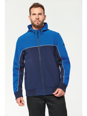Softshell Ripstop de 3 capas. Capa exterior: mini Ripstop 96% poliéster /4% elastán. Capa intermedia: membrana laminada de poliuretano termoplástico transpirable (1000 g/m²/24h), cortavientos e impermeable (2000 mm). Capa interior: micropolar 100% poliéster. Espalda más larga. Cuello alto. Solapa interior contra el mal tiempo y protector de mentón. Ribete reflectante en los hombros y en el bajo de la espalda. Piezas de refuerzo negras de nylon Oxford en los hombros, los codos y el borde inferior de la parte trasera. Costuras de doble pespunte y cremallera SBS. Mangas articuladas y puños ajustables. 2 bolsillos delanteros con cremallera y solapa, 1 bolsillo en el pecho con cremallera a la derecha, 2 bolsillos interiores. Borde inferior ajustable con cordones y bloqueadores. Acceso fácil para la decoración (frontal - espalda - mangas).